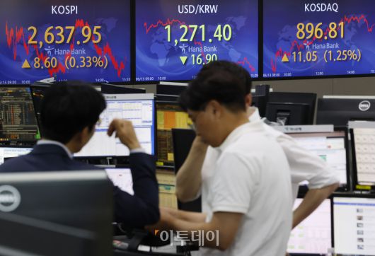 13일 서울 중구 하나은행 딜링룸 전광판에 코스피 지수가 전 거래일보다 8.60(0.33%)포인트 상승한 2637.95를 코스닥 지수가 11.05(1.25%) 상승한 896.81을 나타내고 있다. 원·달러 환율은 전 거래일보다 16.9원 내린 1271.4원을 기록했다. 조현호 기자 hyunho@ |