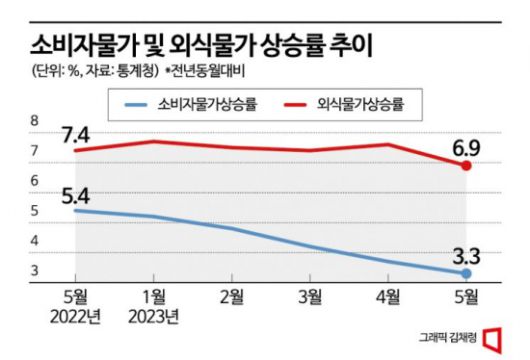 외식물가가 좀처럼 떨어지지 않는 배경은 국제 식량 가격 및 인건비 상승 요인 등 복합적이다. 농림축산식품부에 따르면 외식업 영업비용 중 식자재비 비중이 41%로 가장 높았고, 인건비 34%, 임차료 10%, 수수료 8%, 세금 7% 등으로 구성된다. 지난해 2월 러시아·우크라이나 전쟁으로 같은 해 2분기 곡물 가격이 고점을 찍은 후 크게 낮아졌지만, 품귀현상을 보이는 소금을 시작으로 설탕, 우유, 육류 등 품목 역시 여름철 이상기후와 러시아-우크라이나 곡물수출협정 등 변수에 가격 인상 가능성을 배제할 수 없다는 분석이다.