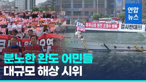 (서울=연합뉴스) 한국수산업경영인 연합회 등 지역 어업인단체는 23일 전남 완도군 완도항 1부두 주변 해변공원에서 '후쿠시마 원전 오염수 방류 반대' 집회를 열었습니다.