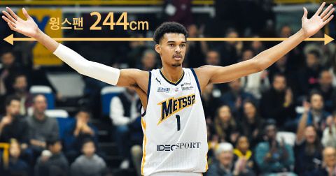 지난해 프랑스 프로농구 리그에서 뛴 빅토르 웸반야마가 두 팔을 벌리고 있다. 그의 손끝에서부터 다른 쪽 끝까지 길이는 244㎝에 달한다. 미프로농구(NBA)에서 팔이 길기로 손꼽히는 케빈 듀랜트(225㎝)보다도 20㎝가량 더 길다. /사진=게티이미지 코리아, 그래픽=김성규 |