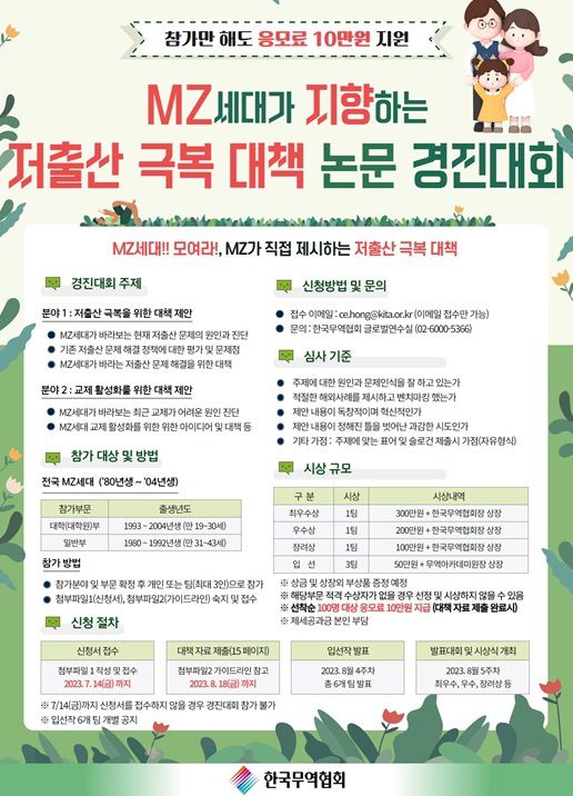 무역협회는 26일부터 다음달 14일까지 ‘MZ 세대가 지향하는 저출산 극복 대책 논문 경진대회’를 개최한다고 밝혔다. 공모 대상 MZ로는 1980년~2004년생으로 한정했다.