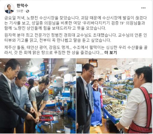 앞서 한 총리는 지난 23일 성일종 의원을 비롯한 국민의힘 '우리바다 지키기 검증 TF(태스크포스)'와 노량진 수산시장을 찾아 제주산 돌돔, 태안산 광어, 강원도 멍게 등을 사 만찬을 했다.