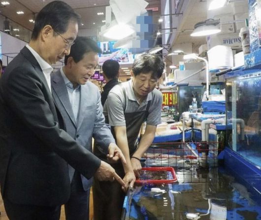 한 총리는 25일 자신의 사회관계망서비스(SNS)에 글을 올려 “금요일 저녁 노량진 수산시장을 찾았다”며 “괴담 때문에 수산시장 발길이 끊겼다는 기사를 보고 성일종 의원님을 비롯한 여당 ‘우리바다지키기 검증 TF’ 의원님들과 함께 노량진 상인들께 힘을 보태드리자고 뜻을 모았다”고 방문 배경을 밝혔다.