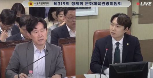 지난 20일 서울시의회 추가경정예산 심사에 참여한 정태익 TBS 대표이사와 김규남 국민의힘 서울시의원. 사진 TBS 유튜브 캡처 |