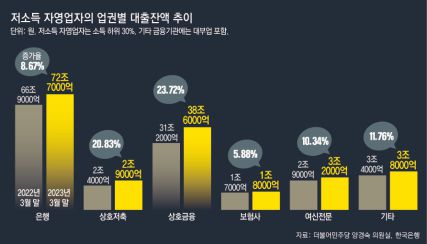 특히 저소득(소득 하위 30%) 자영업자의 2금융권 대출 규모가 급격하게 커지는 점이 우려를 낳고 있다. 저소득 자영업자의 은행 대출 잔액은 1분기 말 기준 전년 동기 대비 8.67% 증가한 72조7000억 원이었다. 같은 기간 저축은행에서는 20.83%, 상호금융에서는 23.72%나 대출 잔액이 불어났다. 은행권에서 밀려난 영세 자영업자들이 더 높은 금리에도 대출을 받고자 2금융권으로 몰리고 있다는 분석이 나온다.