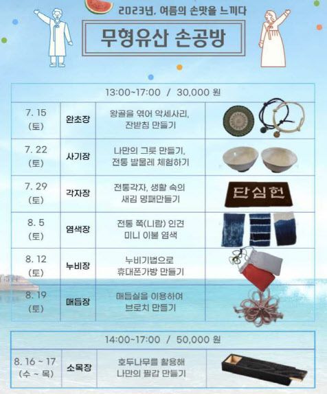 [이데일리 이윤정 기자] 문화재청 국립무형유산원은 여름 방학 및 하계 휴가기간을 맞아 7월 15일부터 8월 19일까지 매주 토요일 전북 전주시 국립무형유산원 전승마루에서 무형유산 주말 체험 프로그램을 진행한다. 가족단위로 무형유산 예능종목을 체험하는 ‘무형유산 가족나들이’와 성인 대상의 공예종목 체험 프로그램인 ‘무형유산 손공방’을 만나볼 수 있다.