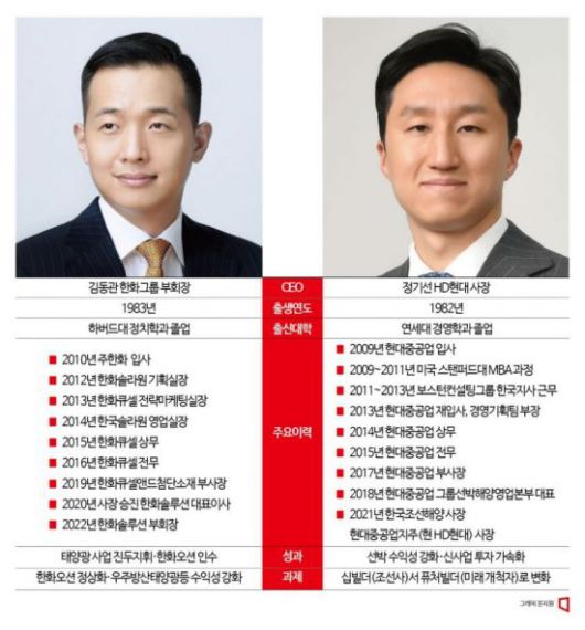 경영 전면에 나선 김동관 한화그룹 부회장과 정기선 HD현대 대표의 말들이다. 두 CEO는 탄소중립시대에 친환경 사업 전환을 통해 새로운 그룹의 미래를 그리고 있다. 또래인데다 아버지 대(代)부터 집안끼리 교류가 있었던 두 CEO는 절친이라고 한다. 하지만 한화그룹이 조선업에 진출한 다음엔 아니란 말도 돈다.