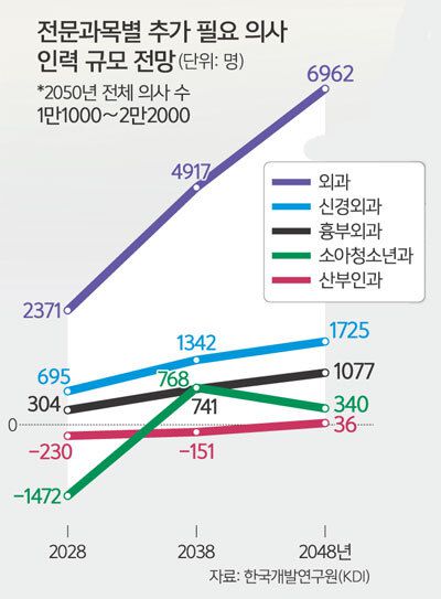 국책연구기관인 한국개발연구원(KDI)과 한국보건사회연구원은 의료서비스 수요와 의사 업무량 등을 고려하면 미래에 의사 인력이 부족할 것이라고 전망했다. 권정현 KDI 연구위원은 이날 복지부 주최로 열린 ‘의사 인력 수급 추계를 위한 전문가 포럼’에서 “현재의 의료 이용 수준으로 평가한 의사 인력의 업무량 수준을 유지하기 위해서는 우리나라 인구 최대치가 전망되는 2050년 기준 약 2만2000명 이상의 의사가 추가로 필요하다”고 말했다. 진료과목별로는 2048년 기준으로 신경과는 1269명, 신경외과 1725명, 흉부외과 1077명, 외과 6962명의 의사가 더 필요할 것이라는 게 권 연구위원 추산이다.