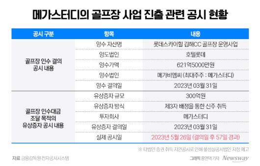 문제는 메가비엠씨의 골프장 인수대금 조달을 위한 제3자 배정 유상증자 공시가 인수와 유증 결의 이후 무려 57일이 지난 5월 26일에 이뤄졌다는 점이다.