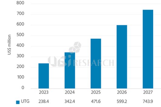 유비리서치는 UTG 시장이 2023년 2억4000만달러에서 2027년 7억4000만달러까지 성장할 것으로 전망했다. 반면 투명 PI 시장은 2023년 1억7000만달러에서 2027년 9500만달러까지 축소될 것으로 전망했다.