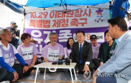 이태원 참사 유가족 만난 이재명 대표 (서울=연합뉴스) 한상균 기자 = 민주당 이재명 대표가 28일 국회 앞에서 이태원 참사 특별법 제정을 촉구하며 단식 농성 중인 유가족을 만나고 있다. 2023.6.28 [공동취재] xyz@yna.co.kr (끝) /사진=연합뉴스 |