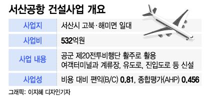 서산공항 건설은 충남 서해안권의 항공 교통 접근성을 개선하기 위해 서산시 고북·해미면 일대에 532억원을 투입해 여객터미널과 계류장, 유도로, 진입도로 등을 설치하는 사업이다. 활주로 등은 공군 제20전투비행단의 기존 시설을 활용한다. 활주로와 여객터미널을 전부 새로 지어야 하는 다른 공항 건설 사업과 비교해 상대적으로 사업비용이 적은 편이다.