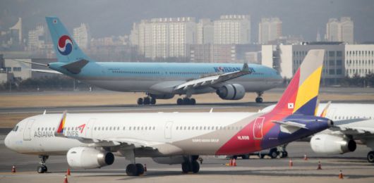 지난해 2월 초 서울 강서구 김포국제공항에 양사 항공기가 주기돼 있다. 뉴시스 |