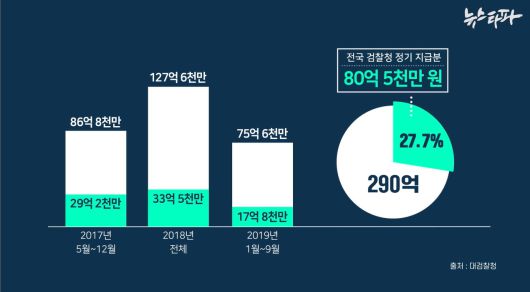 정기 지급분은 모두 80억 5천만 원으로 집계됐다. 전체 특수활동비의 27.7%를 차지했다. 2017년 8개월 동안 29억 2천만 원, 2018년 33억 5천만 원, 2019년 9개월 간 17억 8천만 원이 전국의 각급 검찰청에 보내졌다.