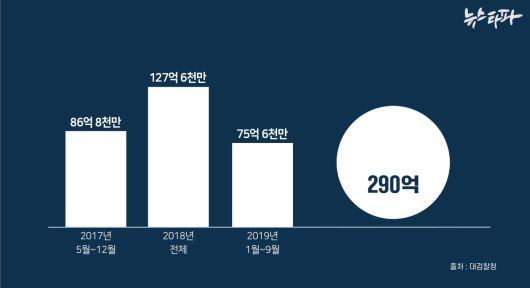 그럼에도 우선 확인한 것은 검찰이 쓴 특수활동비의 총액이다. 2017년 5월부터 2019년 9월까지 총 290억 원을 집행했다. 2017년 8개월 동안 86억 8천만 원, 2018년 127억 6천만 원, 2019년 9개월 간 75억 6천만 원으로 나타났다.