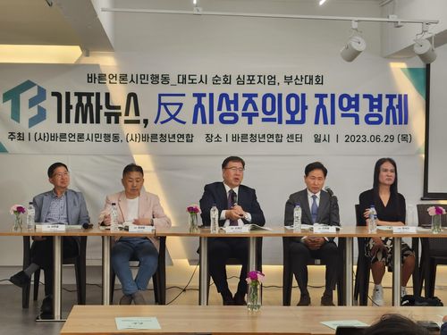 (부산=연합뉴스) 차근호 기자 = 사단법인 바른언론시민행동은 29일 오후 부산에서 후쿠시마 오염수 괴담을 팩트체크하는 '가짜뉴스, 반지성주의 그리고 지역경제' 토론회를 열었다.