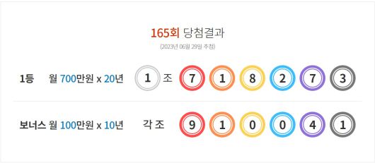 조를 제외한 번호 6자리 숫자가 모두 같은 2등은 5명이다. 2등은 10년간 월 100만원(세전 기준)을 받는다.