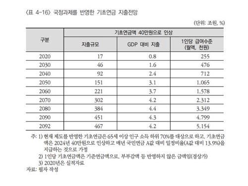 이를 위해 연구진은 2022년부터 2092년까지 80년을 추계기간으로 잡고 현행대로 65세 이상의 소득 하위 70% 노인에게 기초연금을 주는 것으로 추산했다.