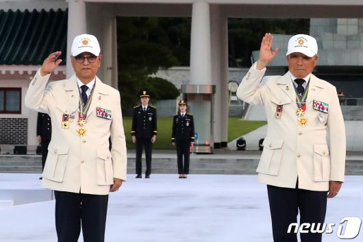(서울=뉴스1) 이승배 기자 = 30일 오후 국립서울현충원 겨레얼마당(잔디광장)에서 열린 '제복-한복 패션쇼, 자락을 펴다'에 6.25 참전 유공자들이 새 제복을 입고 런웨이에 올랐다.