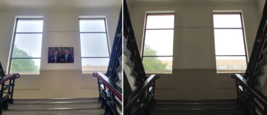 1일 충북도청 2층 계단 통로 중앙에 걸려 있던 윤대통령과 김영환 충북지사의 사진이 철거됐다. 충북도가 본관 갤러리에 윤 대통령 취임 1주년을 기념 사진전을 연 지 하루 만이다. 사진전을 열자 시민단체 등에서 비판 여론이 거세게일었다. 사진은 사진 철거 전(왼쪽)과 철거 후(오른쪽) 모습. |