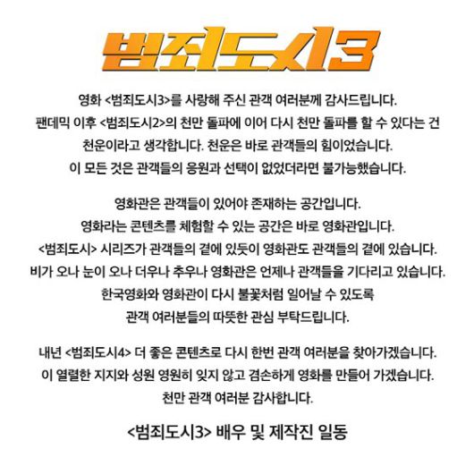 영화 '범죄도시3'가 1일 오전 8시 천만관객을 돌파하고 관객에 감사 인사를 전했다. 사진 에이비오엔터테인먼트, 플러스엠 엔터테인먼트 |
