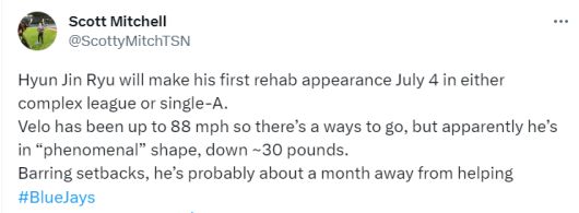 MLB트레이드루머스는 미첼 기사의 트위터를 인용한 보도에서 "선발투수의 빌드업을 마치기 위해서는 몇 주 동안 재활경기에 나가야 한다. 그래도 7월 복귀라는 목표는 여전히 달성할 수 있는 범위로 보인다"며 류현진의 복귀가 7월을 넘기지 않을 수 있다고 내다봤다.
