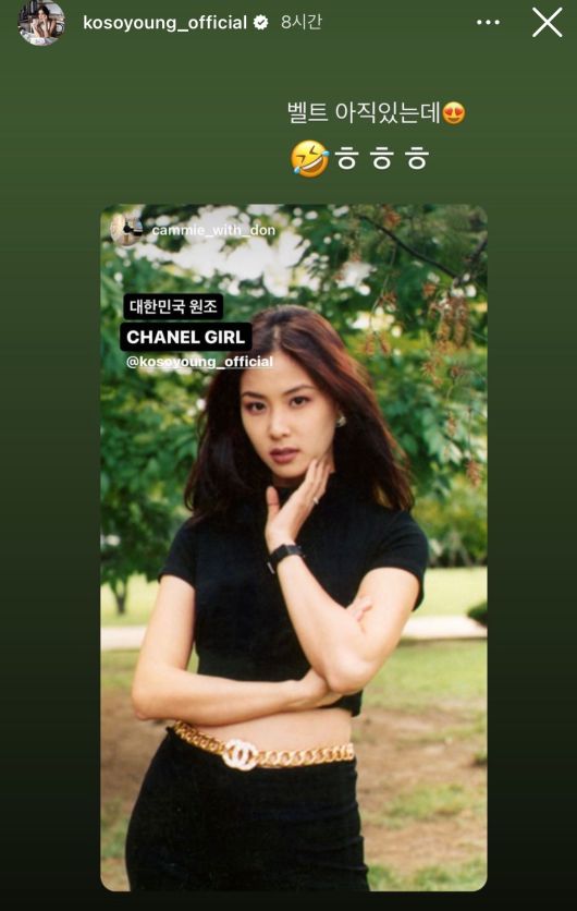 사진에는 "대한민국 원조 샤넬 걸"이라는 문구가 적혀있었고, 이를 본 고소영은 "벨트 아직 있는데ㅎㅎㅎ"라며 하트눈과 웃음을 터뜨리는 이모티콘(그림말)을 썼다.