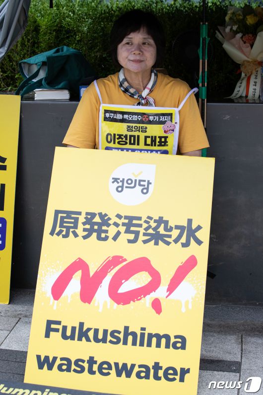 (서울=뉴스1) 유승관 기자 = 이정미 정의당 대표가 3일 서울 종로구 주한일본대사관 앞에서 일본의 후쿠시마 핵오염수 투기 저지를 촉구하며 8일째 단식 농성을 이어가고 있다. 2023.7.3/뉴스1