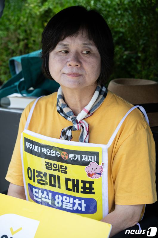 (서울=뉴스1) 유승관 기자 = 이정미 정의당 대표가 3일 서울 종로구 주한일본대사관 앞에서 일본의 후쿠시마 핵오염수 투기 저지를 촉구하며 8일째 단식 농성을 이어가고 있다. 2023.7.3/뉴스1