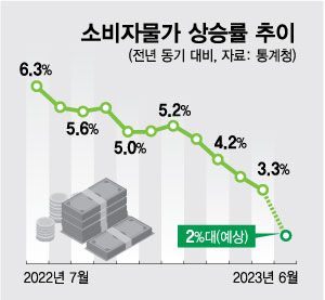 2%대 물가상승폭은 2021년 9월(2.4%) 이후 1년 9개월 만이다. 물가상승률은 지난해 7월 6.3%로 정점을 찍고 이후 5%대를 기록하다가 지난 2월과 3월 4%대를 기록했다. 이어 4월(3.7%)과 5월(3.3%)은 3%대까지 내려왔다.