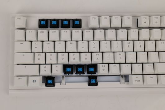 Caps Lock 등 기능 표시 LED는 숫자키 위가 아닌 키캡 아래에 위치해 있다. LED가 키캡 문자 각인 위로 투과해 빛나는데, 화이트 색상과 어울려 독특한 감성을 느낄 수 있다.