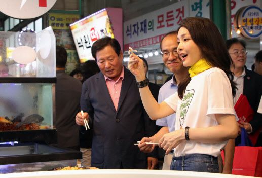 김 여사는 이날 시장 횟집에 들러 사장님께 최근 근황을 묻는 한편, 뜰채로 건져 올린 산오징어회와 광어회 등 해산물을 시식하고 구매했다.