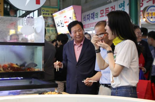 먼저 시장 횟집에 들른 김 여사는 “산오징어를 제일 좋아한다”며 횟집 사장이 수조에서 건져 올려 회를 뜬 오징어와 멍게를 시식했다.