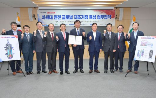 경남도는 4일 오전 도청 도정회의실에서 원전 산업을 대표하는 기관, 기업과 함께 ‘차세대 원전 글로벌 제조거점 육성 업무협약’을 체결했다. 차세대 원전은 차세대 가압경수로(PWR), 용융염원자로(MSR), 소듐냉각고속로(SFR), 초고온가스로(VHTR) 등 소형모듈원자로(SMR)를 말한다.