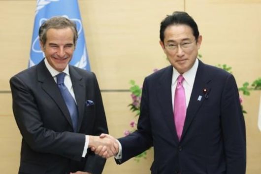 라파엘 그로시 국제원자력기구(IAEA) 사무총장이 4일 도쿄 총리 관저에서 기시다 후미오 일본 총리와 만나 후쿠시마 제1원전 오염수의 해양 방류 계획에 관한 최종 보고서를 전달했다고 교도통신이 보도했다.