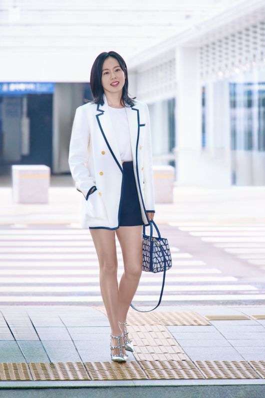 출국을 위해 이날 인천 국제공항에 모습을 드러낸 손예진은 네이비 컬러 라이닝이 들어간 깔끔한 화이트 재킷에 숏팬츠로 세련된 분위기를 연출했다. 네이비 톤으로 통일한 토트백과 시원한 실버 펌프스까지 여름 그 자체의 청량함이 가득한 스타일링이었다.