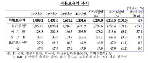 한은이 5일 발표한 외환보유액 통계에 따르면 6월 말 기준 외환보유액은 4천214억5천만달러(약 549조원)로, 5월 말(4천209억8천만달러)보다 4억7천만달러 증가했다.