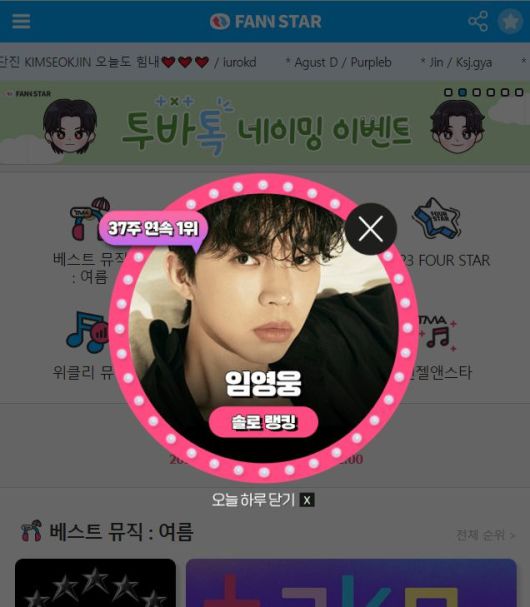 임영웅의 1위 소식과 함께 투표에 참여한 팬들이 '팬앤스타' 공식 문자메시지함으로 축하 인사를 보냈다. 닉네임 '웅사랑해요'는 "임영웅 빛나는 내 가수 응원합니다. 건행"라고 전했다.