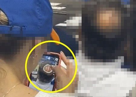 영상에는 한 여성 관중이 앞에 앉은 중년 남성의 뒤통수를 휴대전화로 몰래 촬영해 사진에 낙서까지 하는 모습이 담겼다.