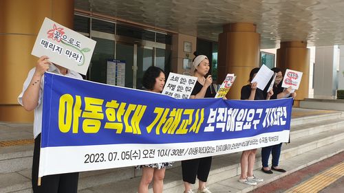(청주=연합뉴스) 변우열 기자 = 청주의 한 지역 학부모들이 5일 충북도교육청에서 기자회견을 열어 "A 초등학교 B 교감이 아동학대(체벌)로 징계를 받은 것을 최근에 알게 됐다"며 "해당 교감을 보직해임하라"고 요구했다.