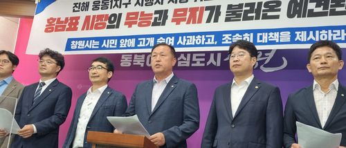 더불어민주당 창원시의원단은 5일 창원시청 프레스센터에서 기자회견을 열고 "창원시가 법원에 낸 웅동1지구 시행자 지정취소 집행정지 가처분 사건이 기각된 것은 (홍남표 시장 취임 이후인) 지난해 12월 말 시가 발표한 웅동1지구 사업에 대한 중간 감사 결과에 따른 예견된 참사"라고 비판했다.