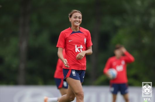 한국 여자 축구대표팀의 케이시 유진 페어가 5일 경기도 파주 국가대표트레이닝센터(NFC)에서 밝은 얼굴로 훈련하고 있다. 대한축구협회 제공 |