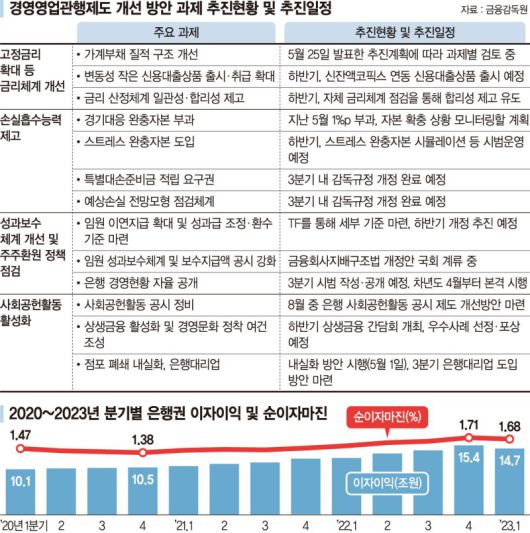 성과보수체계의 경우 장기성과를 기준으로 성과를 받도록 이연지급을 확대하고, 성과급 환수제(claw back) 도입을 추진한다. 내년 4월부터는 은행이 경영 현황을 공개해 스스로 수익과 배당을 잘 관리토록 유도한다.