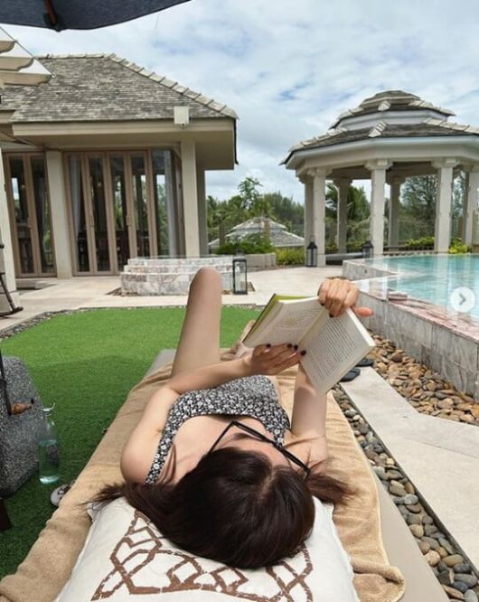 함께 공개한 사진 속에는 지인들과 태국 카오락을 방문한 한채아의 모습이 담겼다. 한채아는 리조트 수영장 선베드에 누워 책을 읽고 있다.
