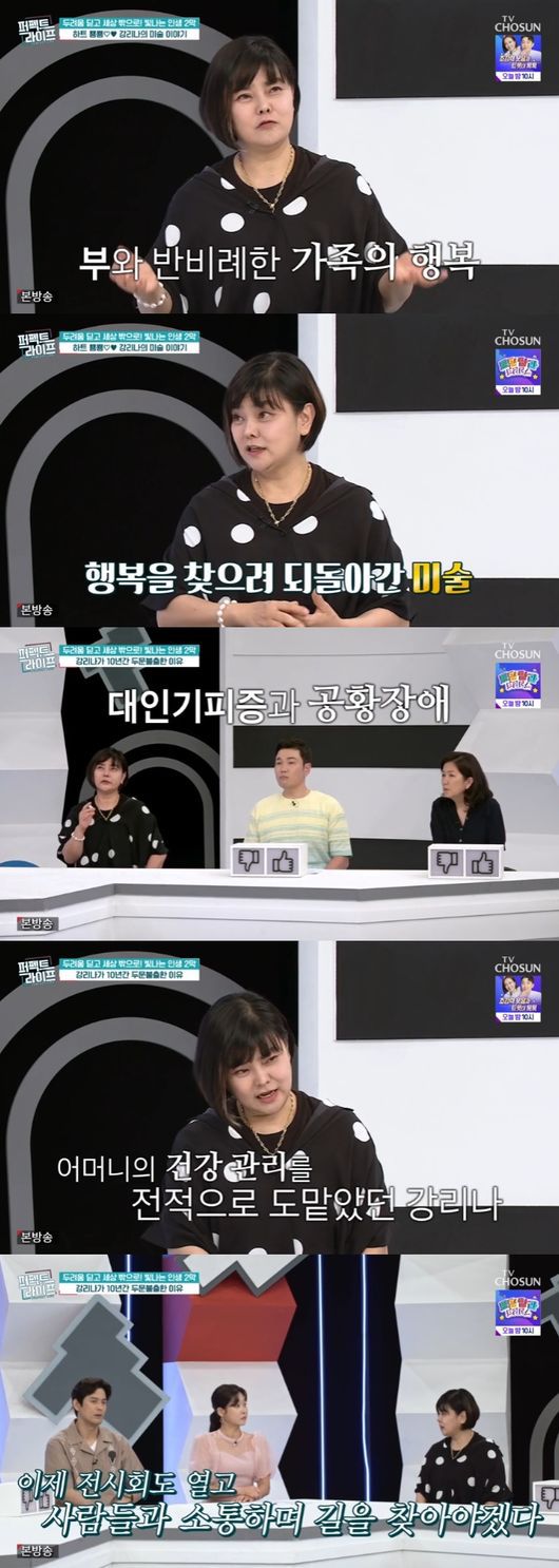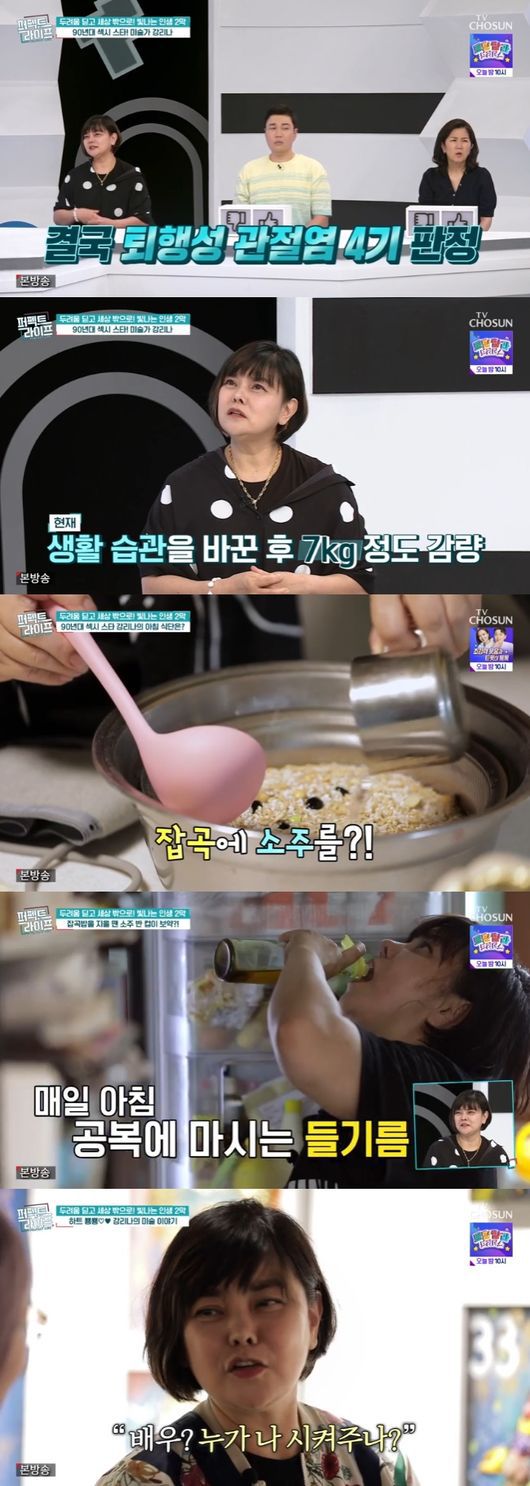5일 방송된 TV조선 '퍼펙트 라이프'에는 90년대 최고의 섹시스타에서 미술가로 변신한 강리나가 출연했다. 올해 59살인 그는 고혈압과 퇴행성 관절염 4기를 앓고 있다고 밝혀 충격을 안겼다.