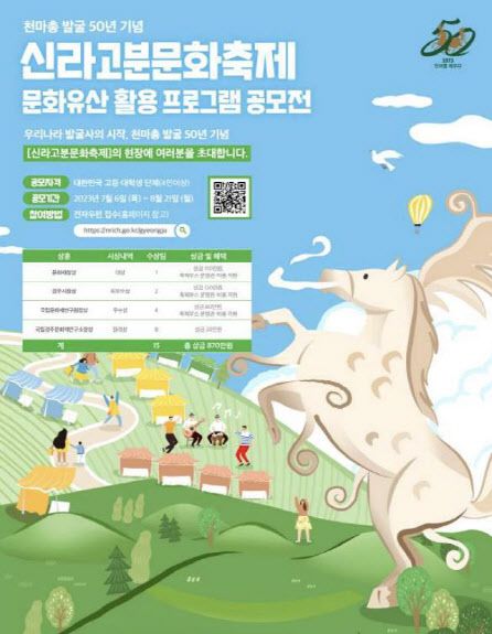 이번 공모전은 신라 고분의 첫 발굴 사례인 천마총 발굴 50주년을 기념해 오는 9월 23일과 24일 양일간 대릉원 일원에서 개최 예정인 ‘신라고분문화축제’와 연계해 진행된다. 공모 대상은 전국의 고등학생과 대학생 단체(4인 이상)다. 신라고분과 관련된 만들기, 체험, 교육 등 문화유산 활용 프로그램 개발을 위한 아이디어를 응모하면 된다.