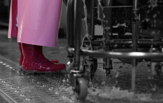 음식의 안전을 지키는 데 모든 초점이 맞춰진 작업복은 입는 사람을 보호하지 못할 때가 많다. 박씨가 말했다. “얼마 전에 어떤 일이 있었냐면요. 저희 조리실 언니가 아침에 과도를 들고 뭘 하다가 손이 미끄러워서 장화 위로 떨어졌어요. 처음엔 그냥 ‘어?’ 하고 말았는데, 조금 이따가 ‘나 발이 이상해’ 하더라고요. 화장실 다녀오더니 ‘나 다리에서 피 나’. 장화 앞이 칼날에 찢겨서 발에 피가 난 거예요. 저희 장화는 하다못해 ‘칼 끝’으로부터도 발을 보호하지 못하는 거죠.”