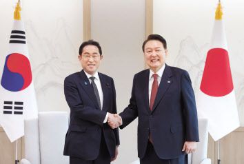 윤석열 대통령과 기시다 후미오 일본 총리가 지난 5월 7일 서울 용산 대통령실 청사에서 열린 한일 정상 소인수 회담에서 악수하고 있다. [연합] |