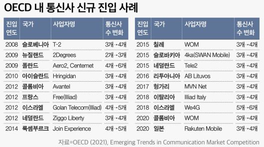 6일 영국 방송통신규제기관 오프콤에 따르면 2010~2015년 기준 신규 사업자가 MNO 시장에 진입한 경제개발협력기구(OECD) 국가는 그렇지 않은 국가보다 평균 통신요금이 10.7~12.4% 낮았다. 2012년 제4 통신사 프리모바일이 출범한 프랑스가 대표적인 예다. 프리모바일은 시장 진입 이후 저렴한 요금제를 앞세워 가입자 연평균 16.7%, 매출 연평균 12.9% 성장률을 기록했다. 2021년 기준 가입자는 1345만명, 매출액은 약 24억달러였다. 당시 가입자 기준 점유율은 19.4%, 매출액 기준 점유율은 10.5%였다. 프랑스 정부는 프리모바일 출범에 앞서 신규 사업자에 주파수를 할당하는 등 정책 지원을 펼쳤었다.