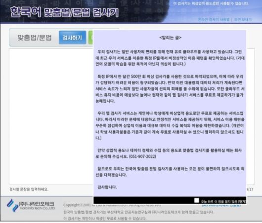 부산대 인공지능연구실과 한국어 맞춤법·문법 검사기를 함께 개발한 나라인포테크는 지난 5일 "최근 우리 서비스를 이용한 특정 IP(인터넷주소)들에서 비정상적인 이용패턴을 확인했다"라며 "거대언어모델(LLM) 학습을 위한 목적이 아닌가 의심된다"고 공지했다. 지난 한달간 특정 IP가 검사기를 500만회 이상 사용하면서 유료 클라우드 서비스 비용이 평소 대비 1.5~2배가량 증가했다는 설명이다.